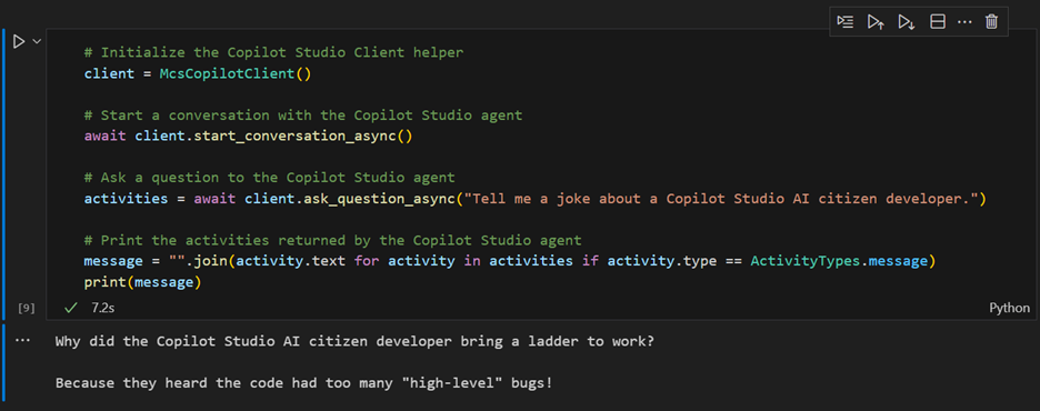 Luego hay un nodo que permite probar rápidamente si la conectividad es correcta, y con suerte obtener un chiste divertido de Copilot 😊